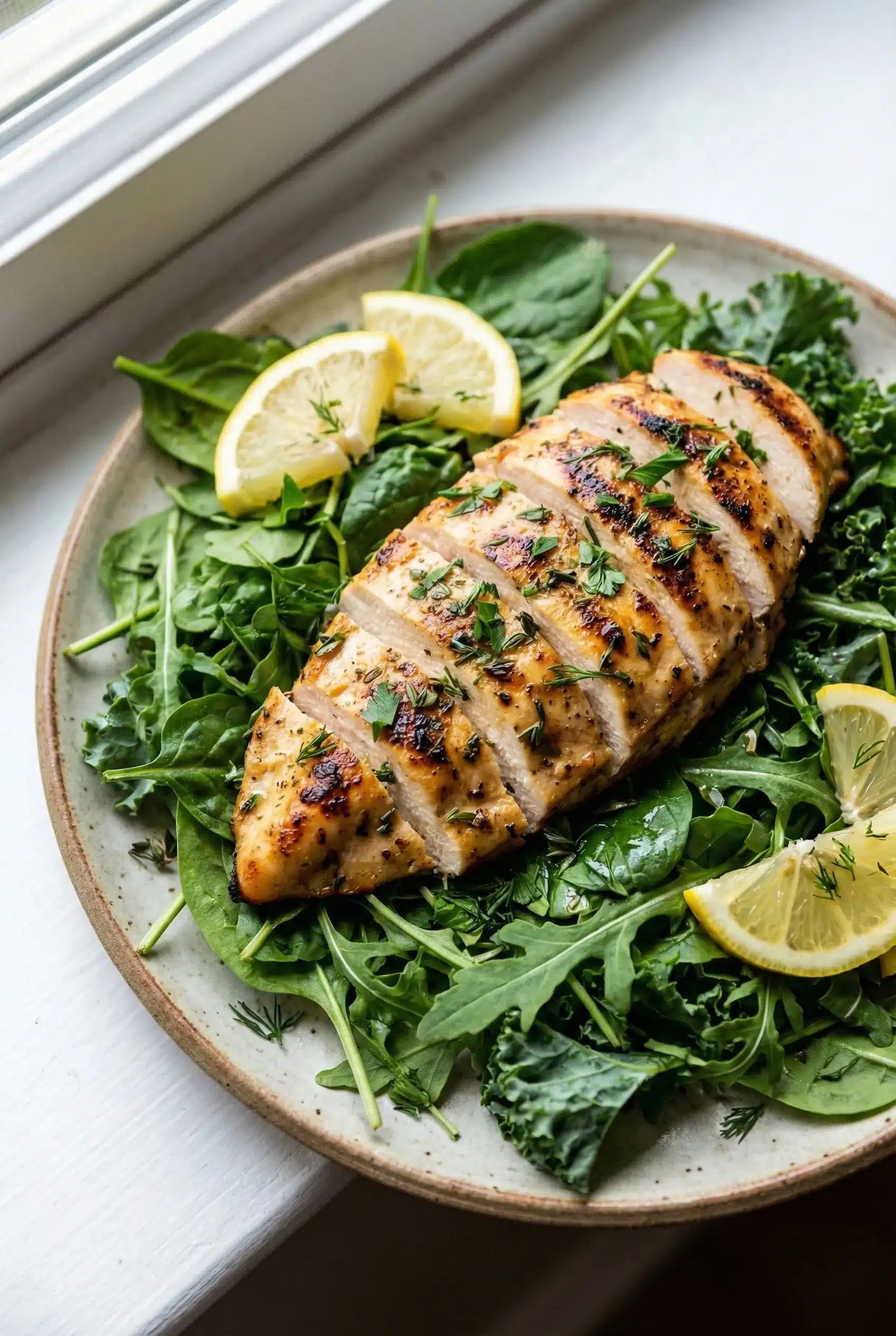 Enjoy a quick and healthy meal with grilled chicken breast and fresh greens, perfect for busy weeknights or a light weekend dinner.