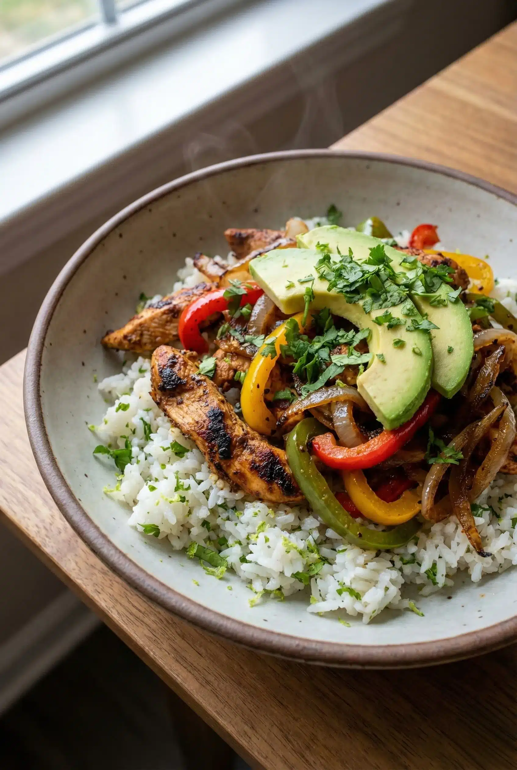 Discover a delicious Chicken Fajita Bowl featuring marinated chicken, colorful bell peppers, zesty rice, and fresh toppings for a vibrant meal.