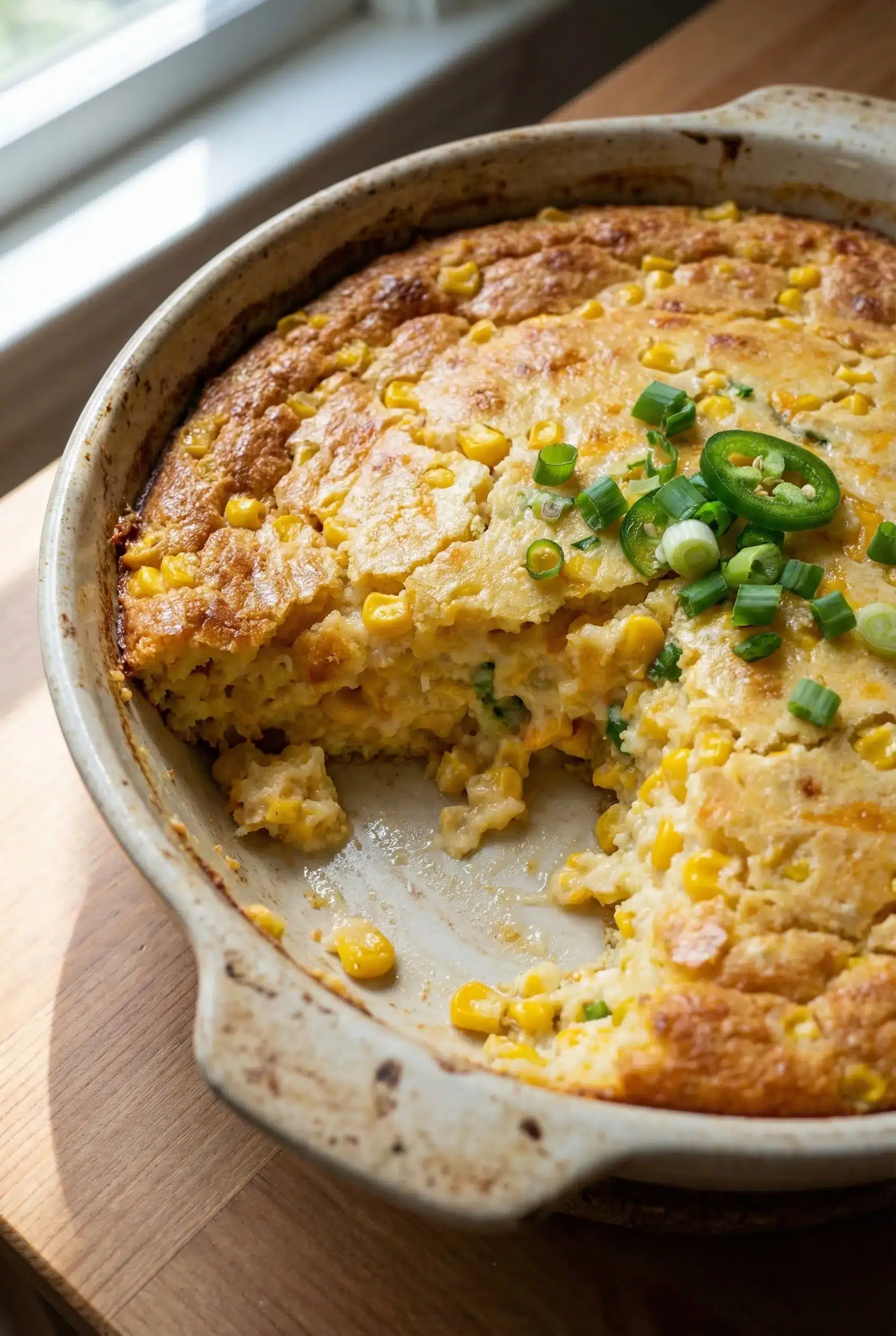 Savor the creamy goodness of corn casserole with a spicy jalapeño twist, combining rich flavors and a delightful texture in every bite.