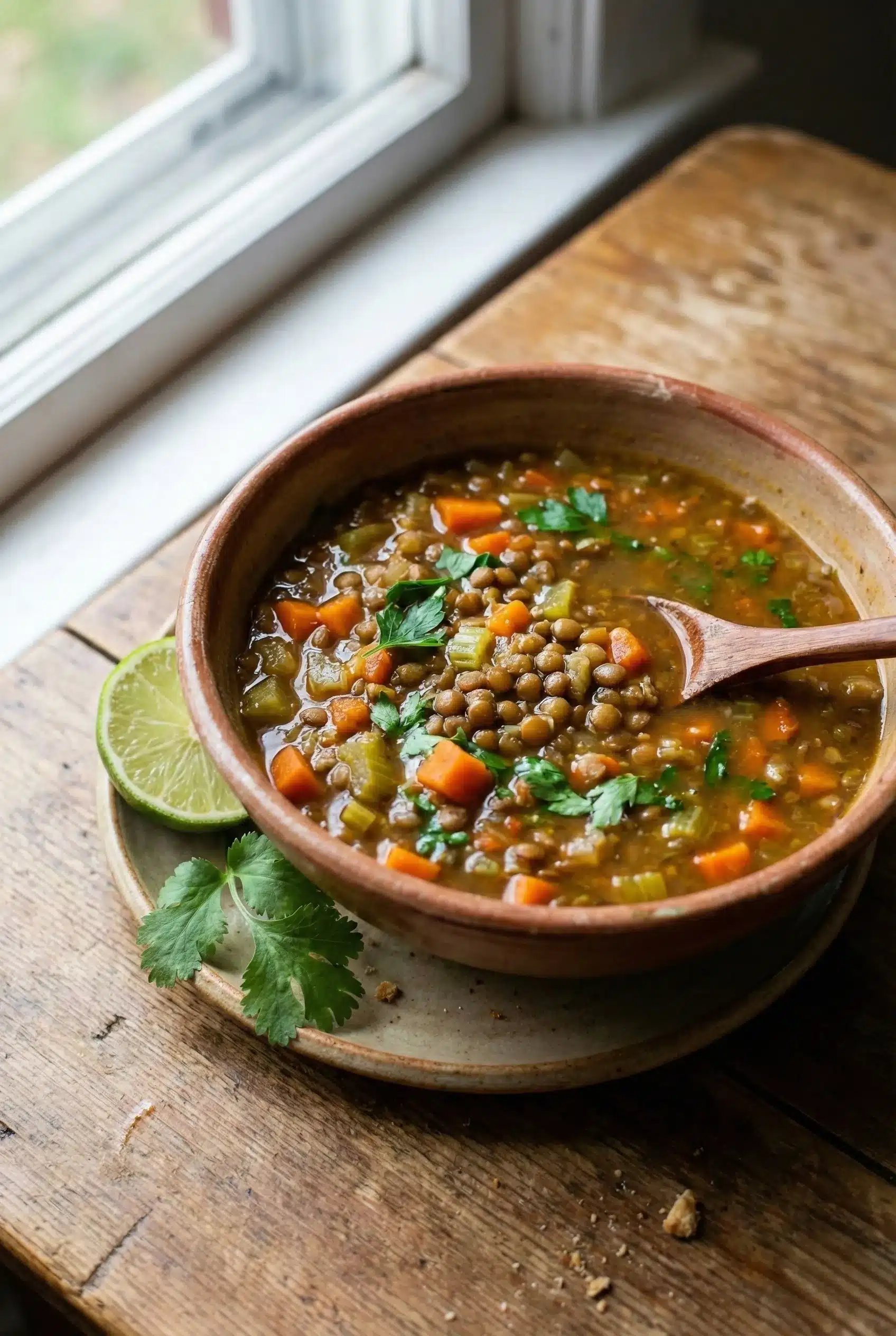 Discover a comforting bowl of hearty lentil and vegetable soup, enriched with a spicy coconut twist for a delightful blend of flavors and textures.