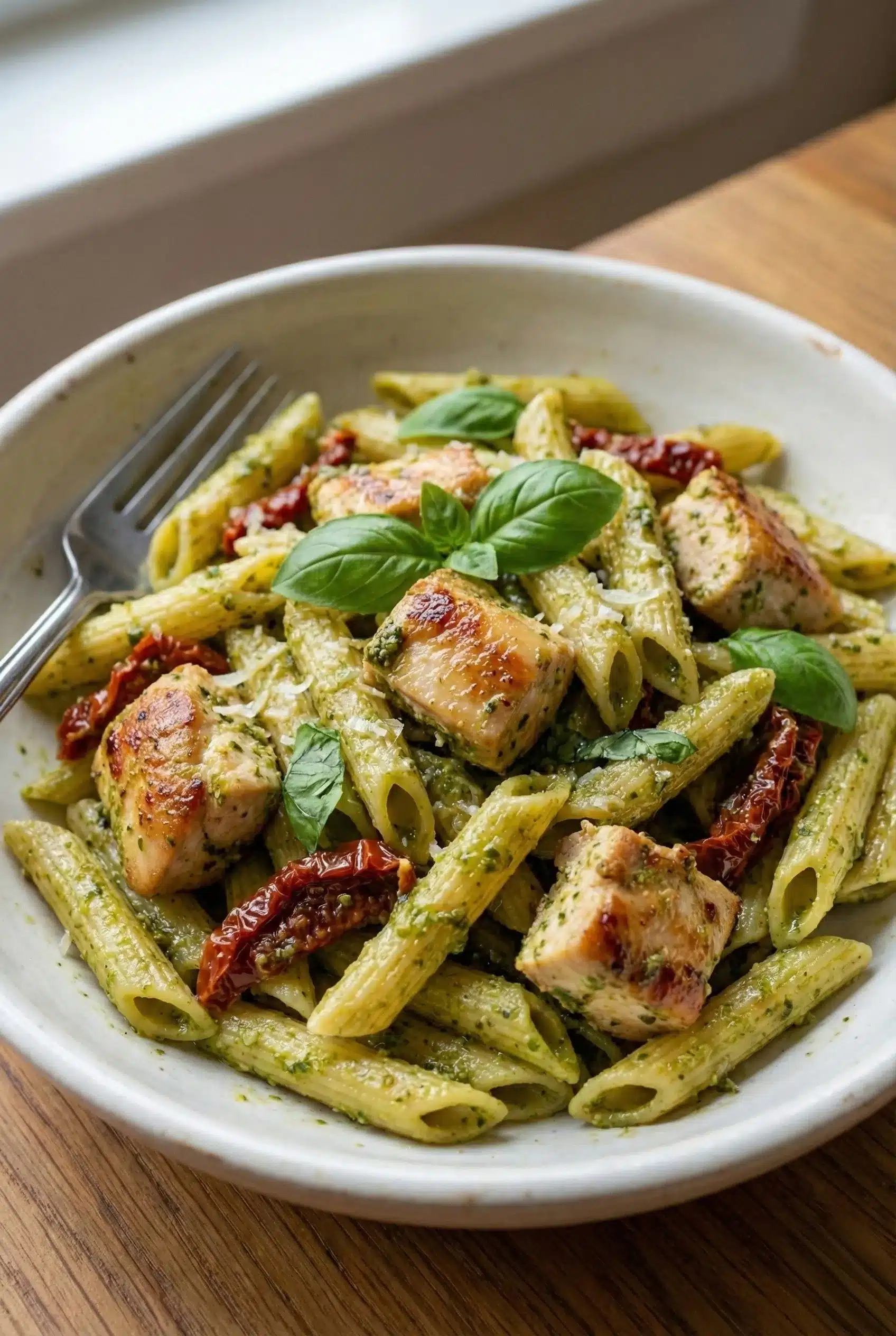 Whip up this quick and flavorful pesto chicken pasta for a satisfying dinner on busy weeknights. Perfect for a fast, delicious meal!